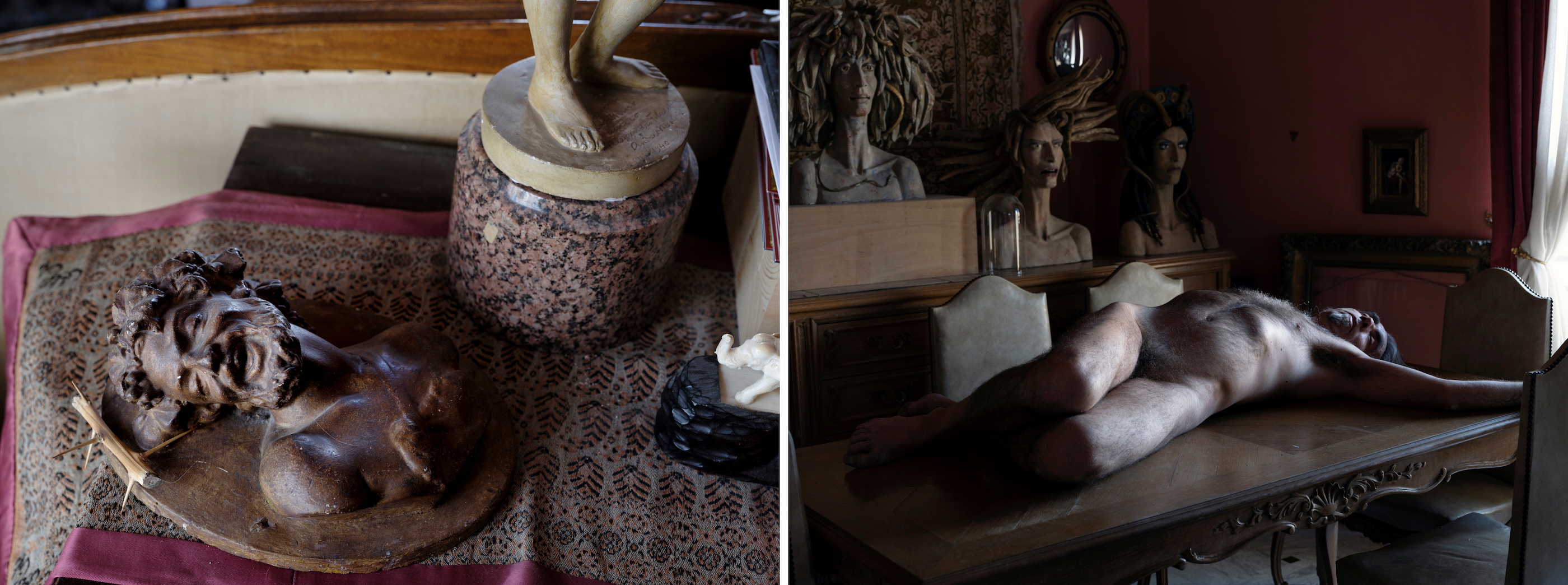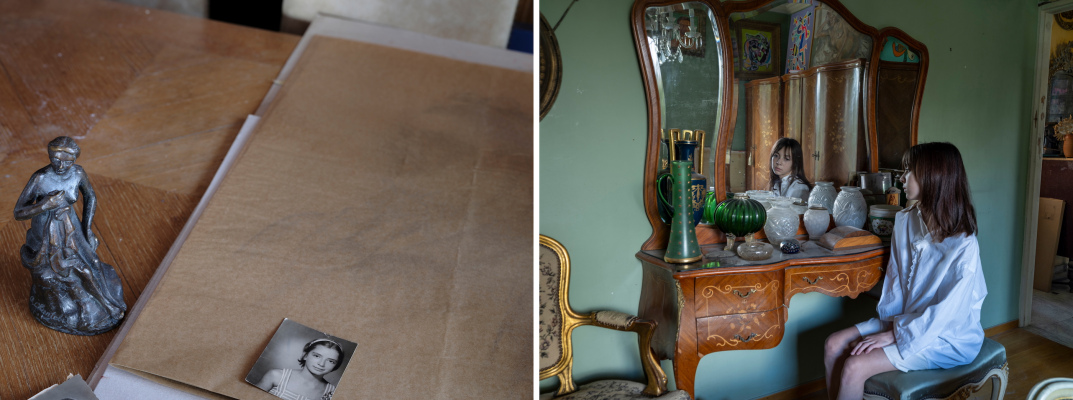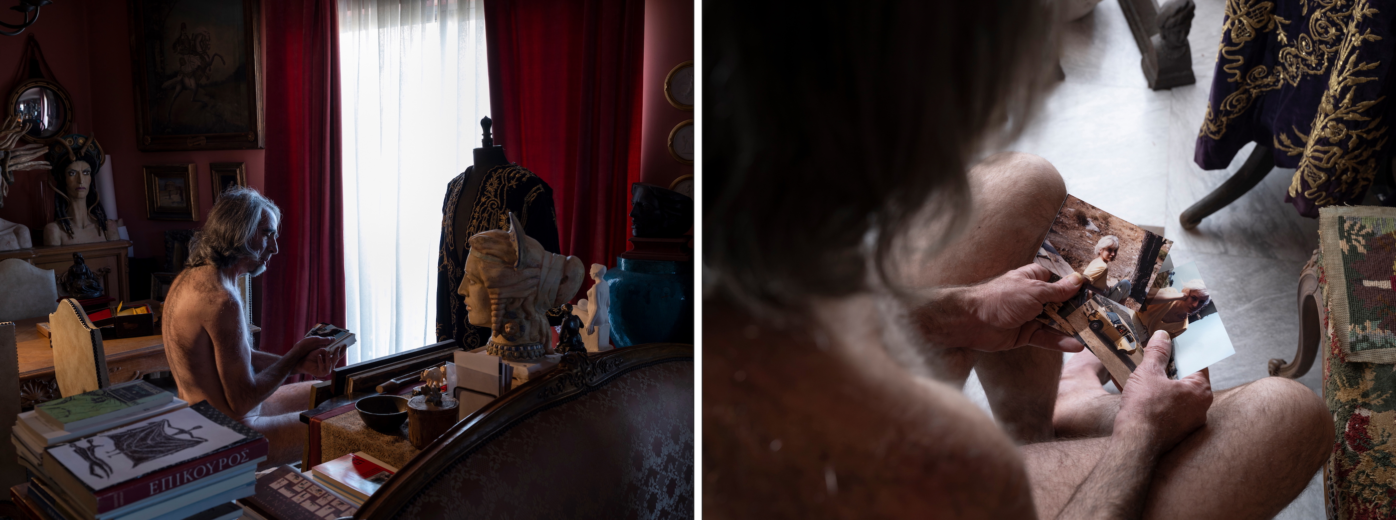 A Stage of Absence How can one speak about absence? Of something indefinite and invisible, yet at the same time real and physical? The rustle of leaves, a fleeting scent, the weight of nostalgia? After the sudden death of his sister, painter & performer Stefanos Chandelis asked me to document the home where Olga lived and worked. I do not know whether he wished to preserve her memory through photography, or if this was a ritual of mourning and reconciliation. For me, Olga existed only as an inferred presence, pieced together from her traces: old photographs, personal items, even plastic bags full of strands of her white hair; a material life now reduced to an urn. What began as a documentation, soon evolved into a performative exploration of absence. Inspired by her traces, fragments of her life were reimagined and recomposed as embodied memories. This process created a fragile, liminal reality, where strangers inhabited her private space, recreating her intimate and imaginary cosmos. Olga’s absence was reimagined with direct reference to classical view camera mise-en-scène thus transforming the camera into a performative tool, but also to the iconography of ecclesiastical paintings, that she worked on, as an art conservator. Three women performed different dimensions of her identity: adolescence, embodied by a girl resembling the artist as a child; the mature artist, depicted as a naked figure symbolizing the clarity and directness of artistic creation; and the elder woman she never became, played by an actress who adapted to directed roles. These selves were set in dialogue with the figure of her brother who appears to emerge out of Dušan Makavejev's cinematic anarchy, yet at the same time integrates the formal gravity of the paintings of Mantegna, Goya and Courbet. His role embodies a paradox: by performing next to these figures his grief is not a process of passive remembrance, but an active dialogue with the sister who was also a maternal figure to him. His intimate and loving gaze is the lens through which we are invited to view this intricate relationship. In this series Olga’s home is both a stage and an archive. A woodland painting above her bed emerged as a symbolic threshold: an escape into nature that balanced her life, and a portal into the dreamscapes that inspired her enigmatic art. This work-in-progress does not attempt to restore what was lost. It looks into mourning itself: fragmented and performative, it becomes an active dialogue between life, memory, and imagination. | Για την Απουσία |
