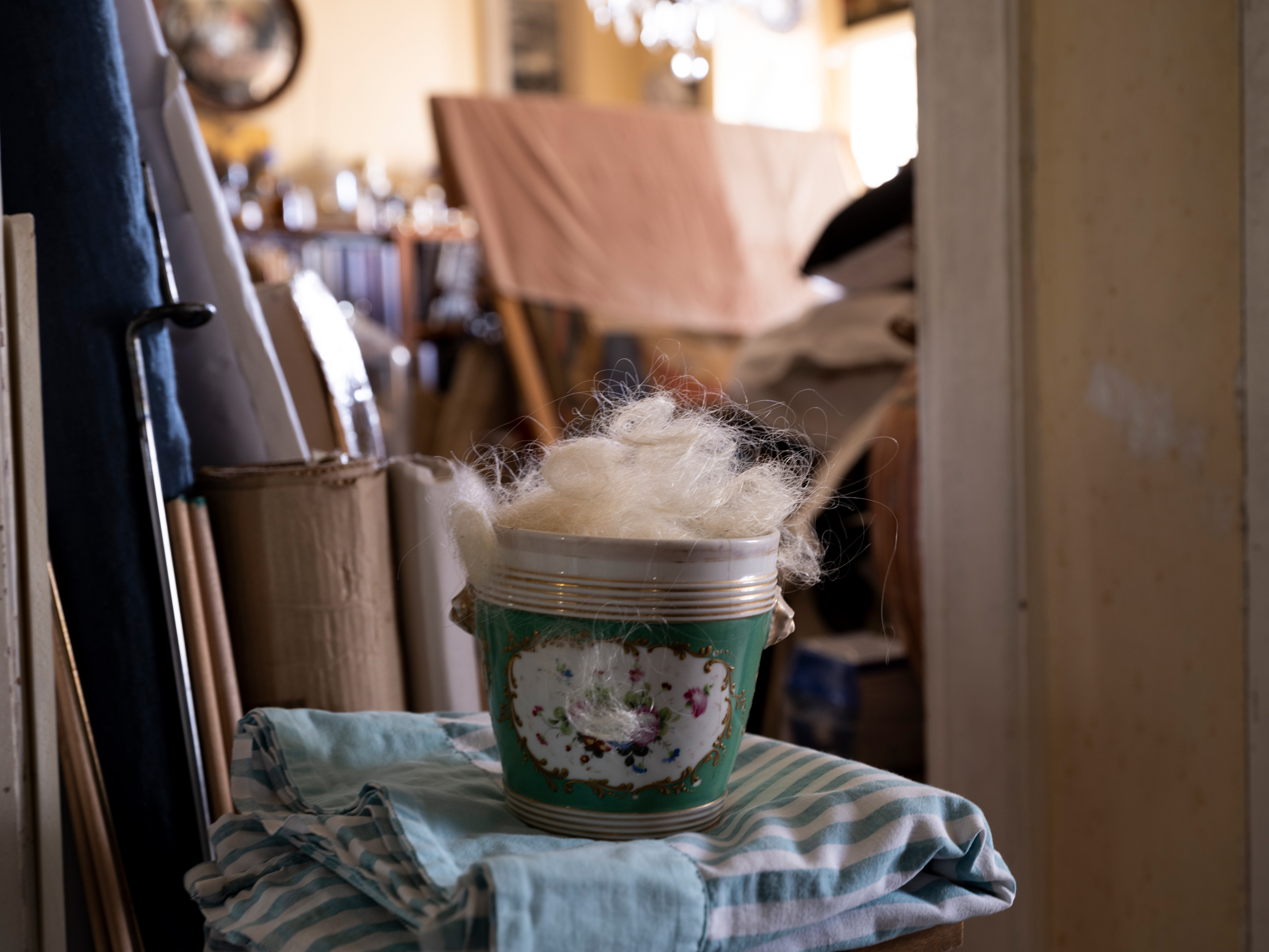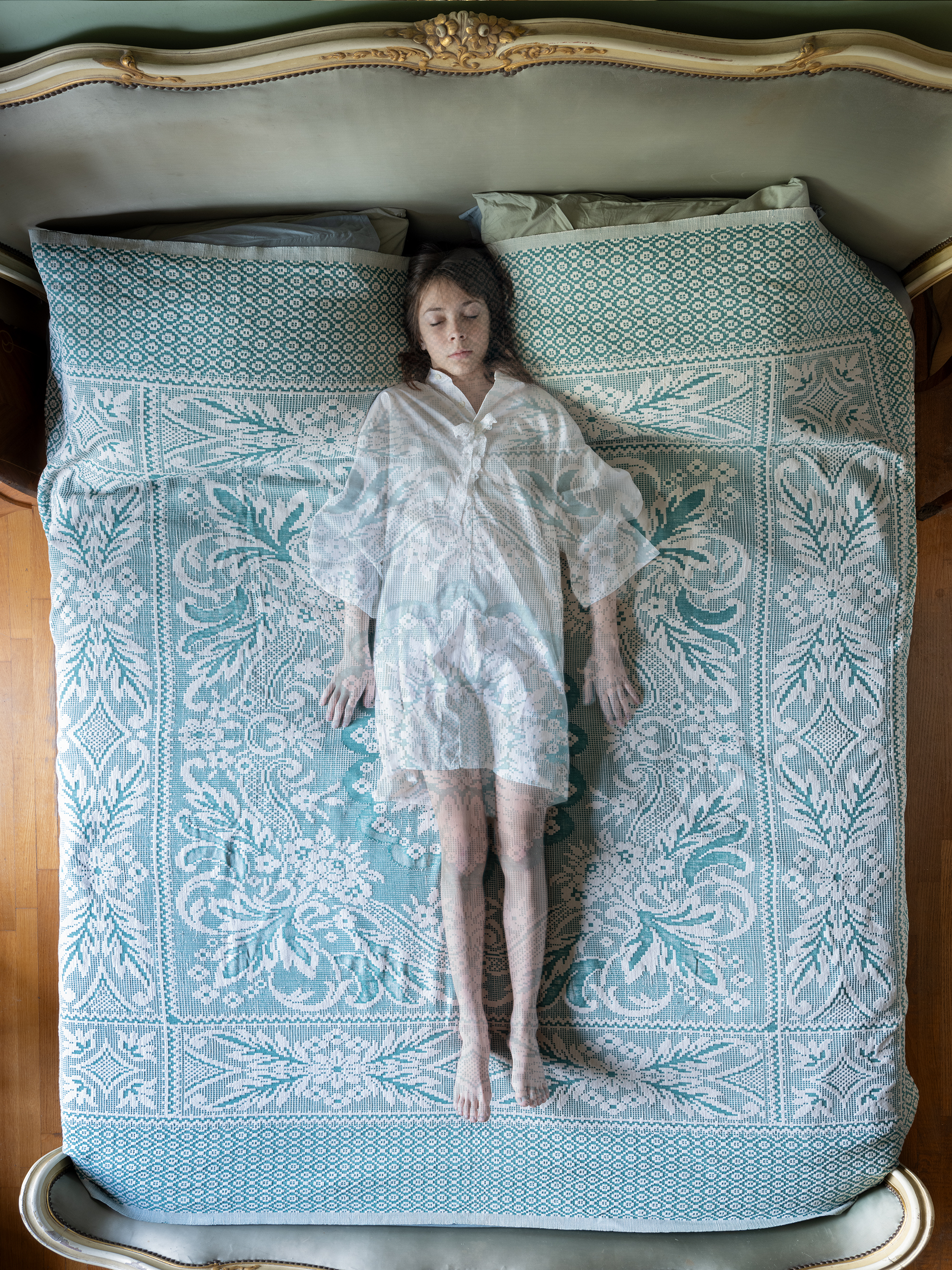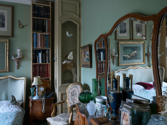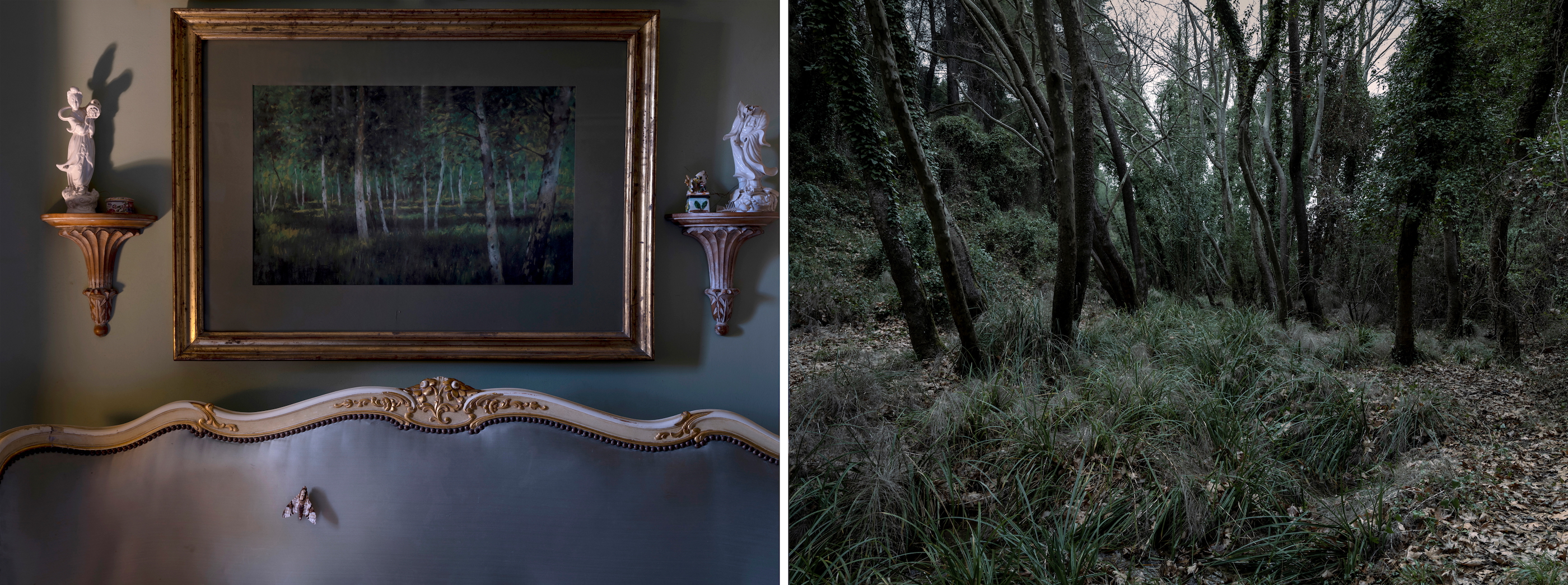 A Stage of Absence How can one speak about absence? Of something indefinite and invisible, yet at the same time real and physical? The rustle of leaves, a fleeting scent, the weight of nostalgia? After the sudden death of his sister, painter & performer Stefanos Chandelis asked me to document the home where Olga lived and worked. I do not know whether he wished to preserve her memory through photography, or if this was a ritual of mourning and reconciliation. For me, Olga existed only as an inferred presence, pieced together from her traces: old photographs, personal items, even plastic bags full of strands of her white hair; a material life now reduced to an urn. What began as a documentation, soon evolved into a performative exploration of absence. Inspired by her traces, fragments of her life were reimagined and recomposed as embodied memories. This process created a fragile, liminal reality, where strangers inhabited her private space, recreating her intimate and imaginary cosmos. Olga’s absence was reimagined with direct reference to classical view camera mise-en-scène thus transforming the camera into a performative tool, but also to the iconography of ecclesiastical paintings, that she worked on, as an art conservator. Three women performed different dimensions of her identity: adolescence, embodied by a girl resembling the artist as a child; the mature artist, depicted as a naked figure symbolizing the clarity and directness of artistic creation; and the elder woman she never became, played by an actress who adapted to directed roles. These selves were set in dialogue with the figure of her brother who appears to emerge out of Dušan Makavejev's cinematic anarchy, yet at the same time integrates the formal gravity of the paintings of Mantegna, Goya and Courbet. His role embodies a paradox: by performing next to these figures his grief is not a process of passive remembrance, but an active dialogue with the sister who was also a maternal figure to him. His intimate and loving gaze is the lens through which we are invited to view this intricate relationship. In this series Olga’s home is both a stage and an archive. A woodland painting above her bed emerged as a symbolic threshold: an escape into nature that balanced her life, and a portal into the dreamscapes that inspired her enigmatic art. This work-in-progress does not attempt to restore what was lost. It looks into mourning itself: fragmented and performative, it becomes an active dialogue between life, memory, and imagination. | Για την Απουσία |